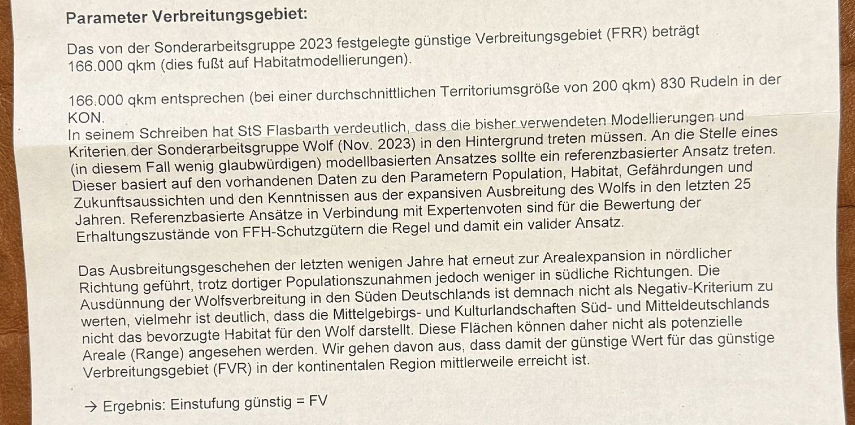 Fachleute hatten auf Basis einer aufwendigen Habitatmodellierung ein „günstiges Verbreitungsgebiet“ (FRR) von 166.600 bis 273.100 km² für den Wolf berechnet und den höheren Wert von 273.100 km² ausdrücklich bevorzugt, um die langfristige Überlebensfähigkeit der Art sicherzustellen. Ein Schreiben vom Staatssekretär im Bundesumweltministerium, Jochen Flasbarth, ordnete jedoch an, diese modellierten Werte nicht als Referenz zu verwenden. [3] Stattdessen setzte er einen „referenzbasierten Ansatz“ durch, der allein auf der aktuell von Wölfen besiedelten Fläche beruht.